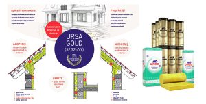 Noua gamă URSA GOLD presupune saltele de vată minerală de sticlă comprimate cu până la 1: 2,8, marcate cu linii pe o parte pentru o tăiere mai ușoară, cașerate cu pâslă de fibră de sticlă galbenă, hidrofobizate în întreaga secţiune. Cu o conductivitate termică excelentă λD – 0,032 W/mK, produsul este disponibil cu diverse grosimi, care să asigure rezistența termică necesară: 100 mm (RD – 3,10 m2K/W); 120 mm (RD – 3,75 m2K/W), 140 mm (RD – 4,35 m2K/W) și 160 mm (RD – 5,00 m2K/W).